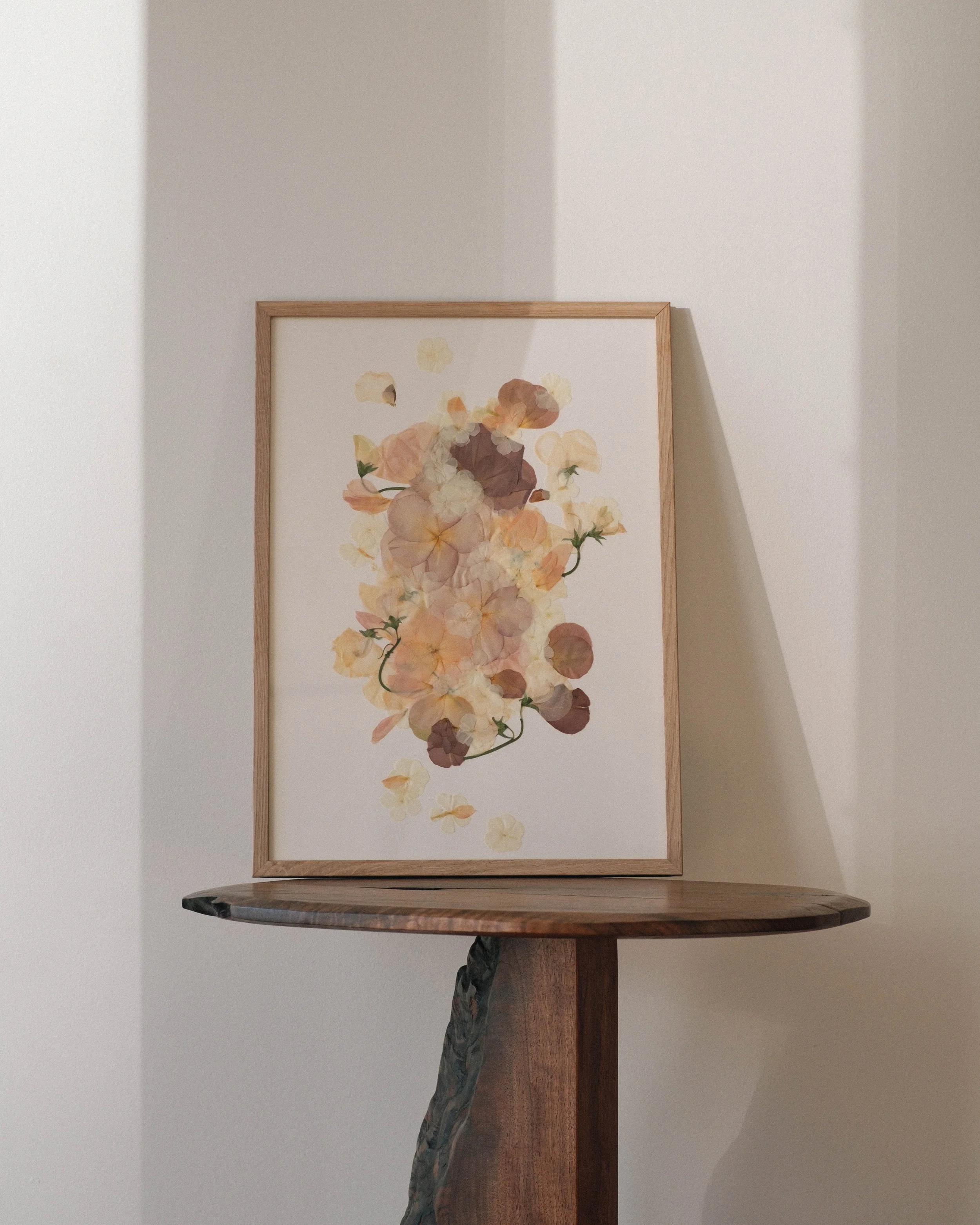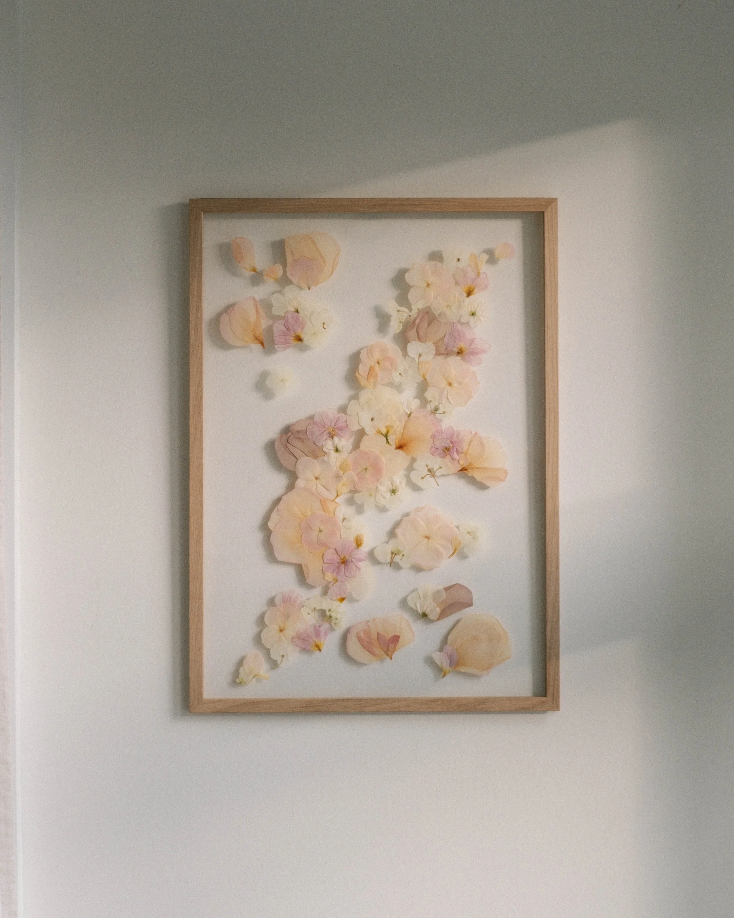 Our pressed floral pieces are an interpretation, not an exact bouquet replica. Each composition is designed with intention, focusing on balance, texture, restraint, and emotional tone.